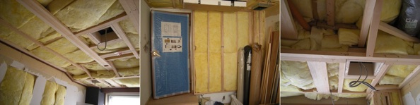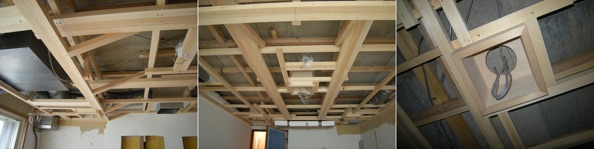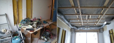 一旦着手すると解体が早いのはどこのリフォームも同じで、あとは作業がコツコツと進み、ゴールデンウィーク前には機材を持ち込めるところまでこぎ着けた。工事の詳細を書き出すとエンドレスに長くなるので写真を見ていただくことで箸折るが、上から解体、空調周り、吊り天井、吸音材充填という工事の流れだ。